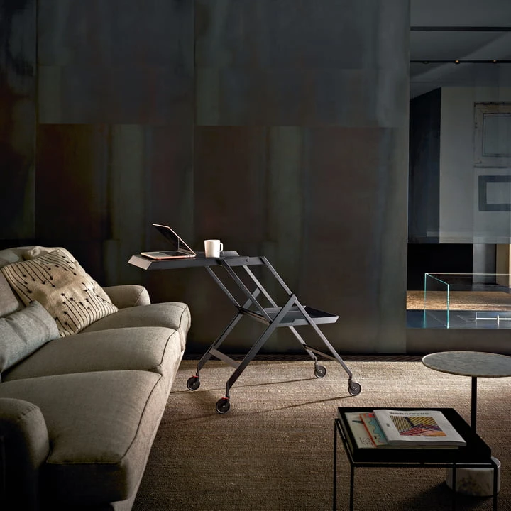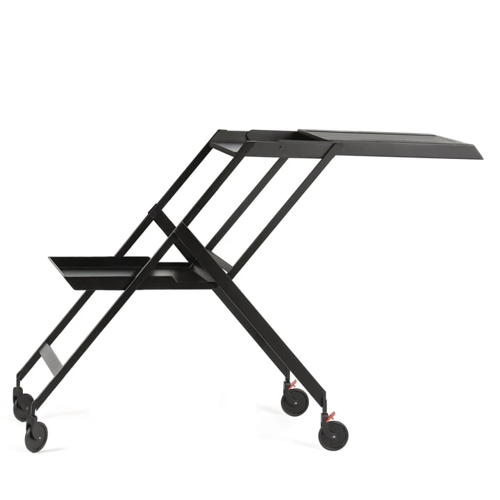 Based on the design by Richard Sapper from the 1970s, the Plico serving trolley was designed by Alessi . The elegant serving trolley is ideal as a mini bar for your own four walls or for serving cocktails and small snacks on two levels. Alternatively, the small black trolley can also be used as a side table or bedside table. It is particularly space-saving – when folded up it fits behind a door or Plico behind a door or even in smaller storage rooms without any problems.