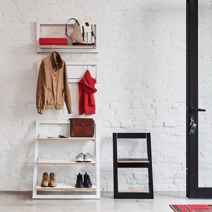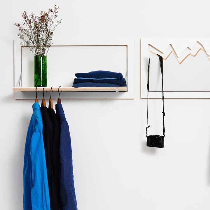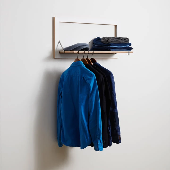 The FlÀpps clothes rail from Ambivalenz appears at first glance like an ordinary wall shelf from Ambivalenz and is only at second glance, when the wardrobe is folded out, to be recognized as a clothes rail with additional storage. When folded, only a narrow slot indicates its additional function. By means of hooks and hangers coats, jackets, bags, scarves and much more can find a place on the coat rack. The shelf is intended for keys, reading glasses and wallet.