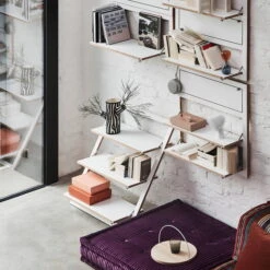 The shelves are made of multiplex birch with stainless steel hinges. They are painted by hand and are available in different colors. A small loop made of felt facilitates the folding down of the shelf.