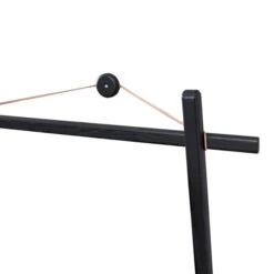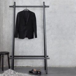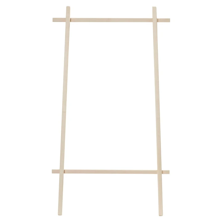 The clothes rack consists of two wooden poles, which become a stable construction with two crossbars. This design is installed on the wall as follows: A bracket is attached to the wall on height of the coat rack’s top edge. Two rubber bands are connected with the bracket and now wrapped around the clothes rack’s poles. The wooden frame is now securely held by the construction with the rubber bands on the wall and stabilizes itself with its feet, which press against the wall and waste no space in the room. When installed, hangers and hooks can go perfectly on the clothes rail. In addition, objects also allow to be hung on the laterally protruding ends of the top pole.
