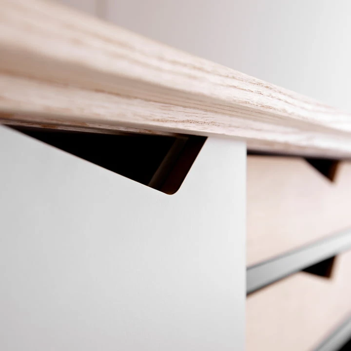 For the body of the dresser you can choose between solid ash, oak or walnut and the doors are available in nine different colors. The doors are lacquered in two colors. On the one hand they convince with the selected desired color and on the other hand they are timeless black lacquered. Depending on your preference, you can then decide which color should adorn the front of the chest of drawers.