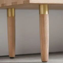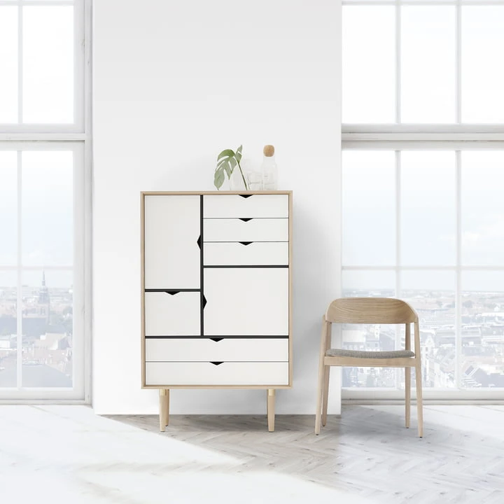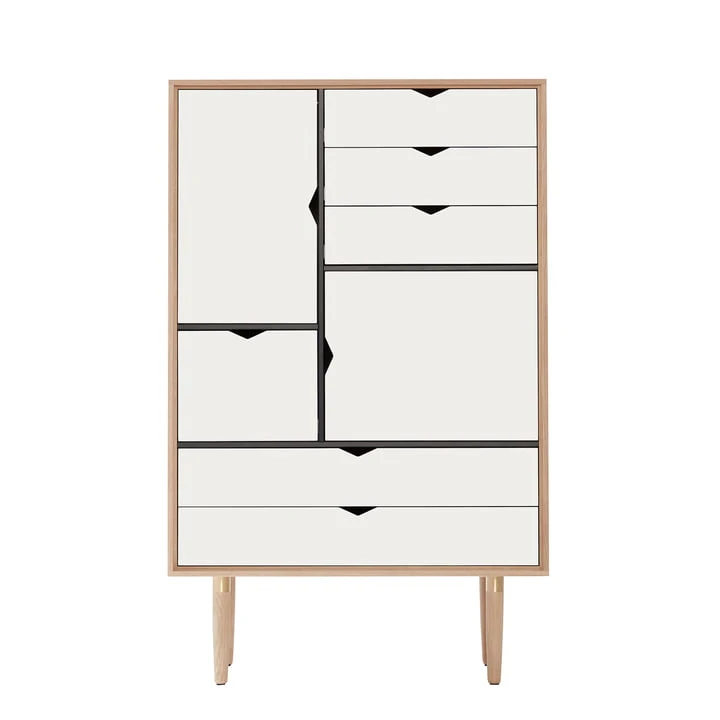 S5 is made of solid oak in oiled, soaped or black lacquered or solid oiled walnut with mortise and tenon joints and has turned feet with brass finish. The monochrome version of S5 has drawer fronts and doors in a plain white. S5 However, there is also a multi-coloured version. This features silver, metallic grey and beige on the drawers and doors.