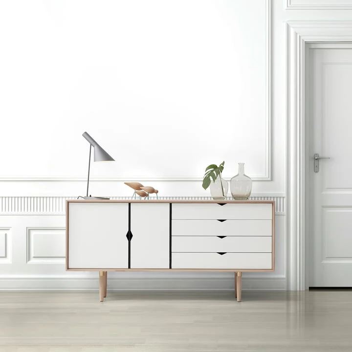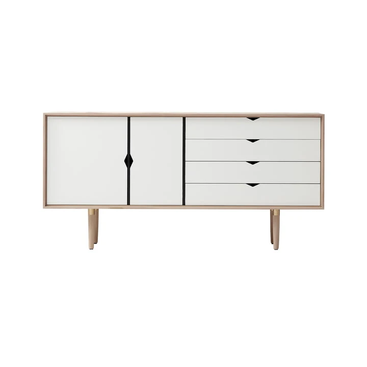 S6 is made of solid oak in oiled, soaped or black lacquered or solid oiled walnut with mortise-and-tenon joints and has turned feet with brass finish. The monochrome version of S6 has drawer fronts and doors in a plain white. However, S6 also comes in a multi-colored version. This impresses with the colours silver, metallic grey and beige on drawers and doors. The backs and dividers are black in each version.