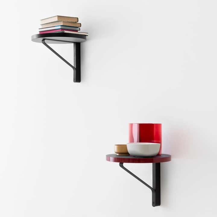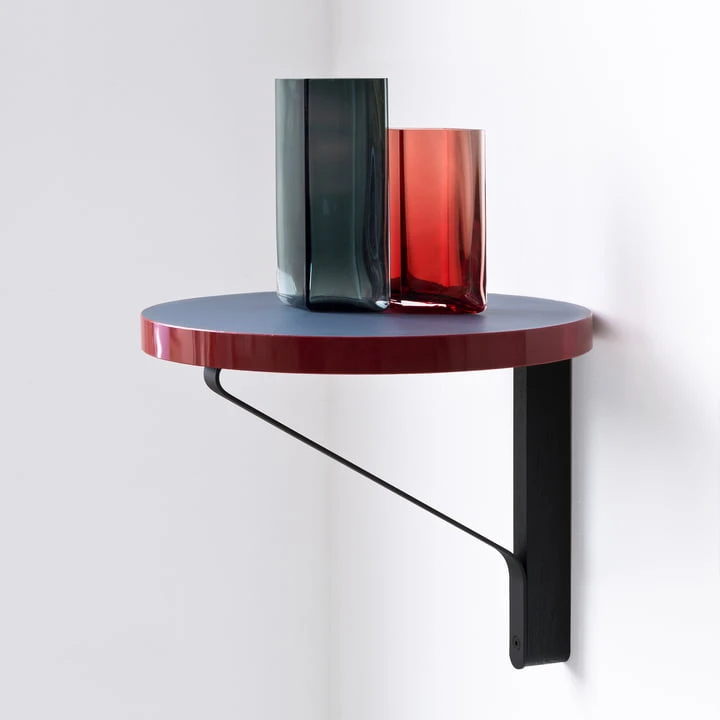 The round REB 007 Kaari Wall Shelf by Artek is part of an innovative collection by Ronan and Erwan Bouroullec, the concept of which is based on a special table leg. The table leg has been transformed for the shelf, acting as a bracket for the round panel.