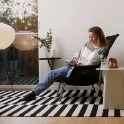 Diagonal, bent steel struts, which provide support for the tables in the collection, provide horizontal stability for the round panel. The combination of solid oak and a soft, metal bend give the furniture a surprisingly lightweight appearance. It is a construction that supports a wide variety of tabletops and shelves – big and small, round and square, low and high.