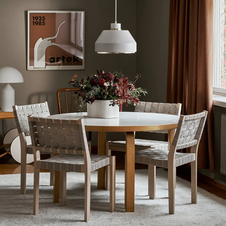 The 90B table by Alvar Aalto for Artek is made from Finnish birch and exudes a natural warmth. The tabletop with a diameter of 75 cm is made from white laminate.