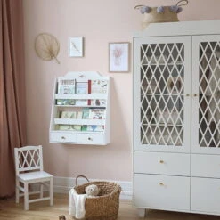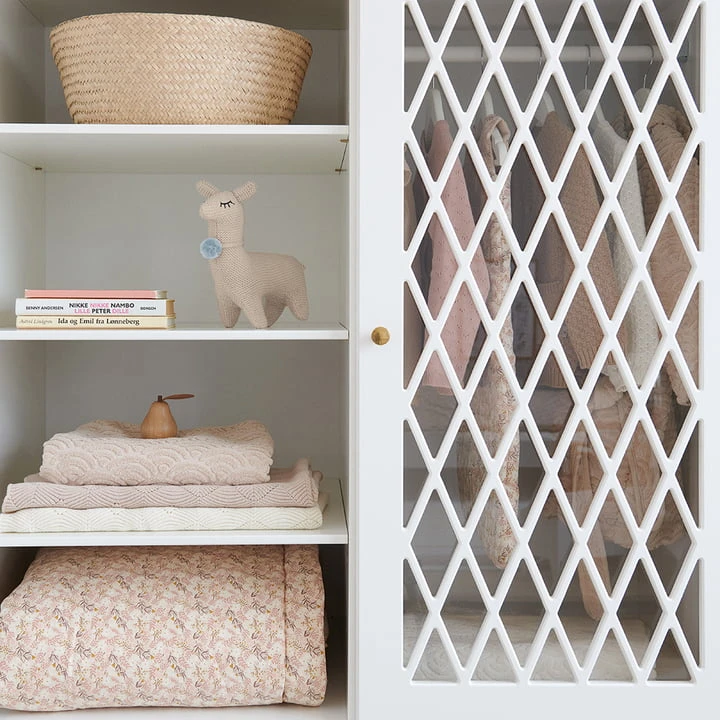 The Harlequin Closet from Cam Cam Copenhagen is a classic piece of furniture, which can be used for many years by each family member. It offers four practical drawers, four shelves and a clothes rail for hangers. The glass-through area on the door of the closet offers insight into the aesthetically sorted interior of the closet. The drawers feature pretty, minimalist brass handles. The wardrobe is available in different finishes.