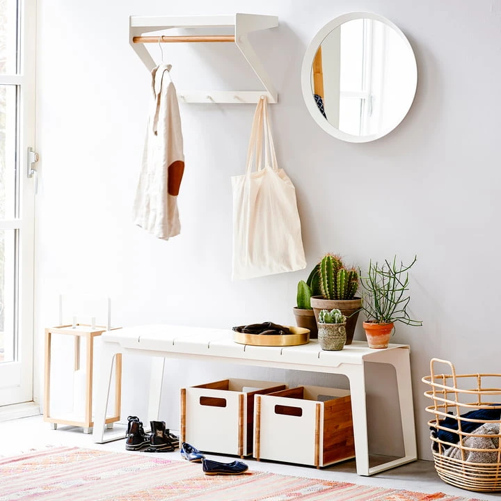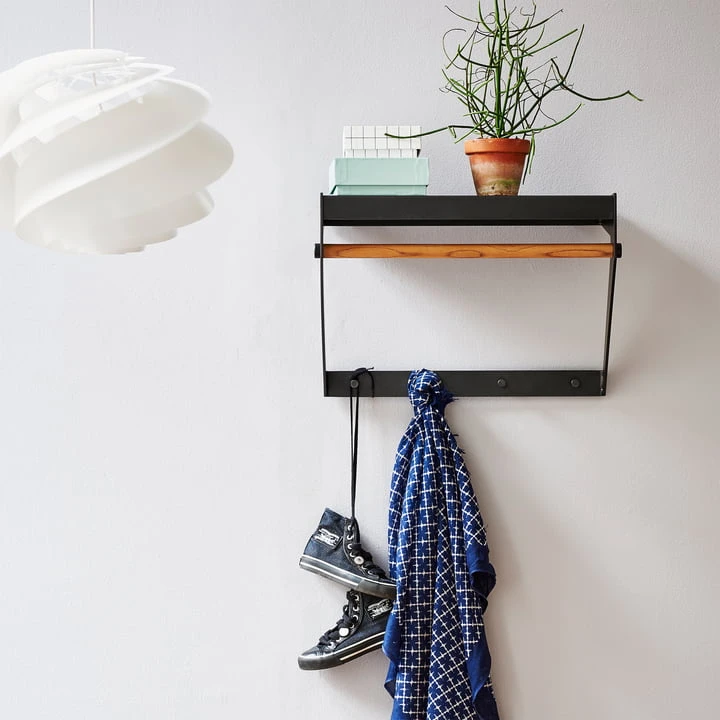 The Copenhagen City Rack by Cane-line is a hanging wardrobe for urban and modern interiors. The Danish designer duo Strand + Hvass wanted to make life in small city apartments easier and more practical with the wardrobe. It takes up little space and is very functional. Four hooks, a coat rail and a shelf above it offer space for jackets, scarves, hats, accessories and much more.