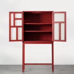Air is a cabinet made of an orderly, graphic frame construction in combination with walls made of a traditional reed wickerwork, giving it a special feeling of lightness and transparency. Even more lightness is provided by the filigree base, which raises the body of the cabinet.