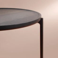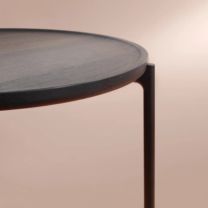 The table can function as a coffee table, a storage table or a bedside table, and with its round storage surface it offers enough space for books, vases and decorations. The table consists of a top made of solid oak wood and a frame made of powder-coated aluminum in black. The table top is somewhat reminiscent of a tray due to a slight elevation at the edge of the table, but the elevation has been rounded so that crumbs and the like can be easily wiped off.