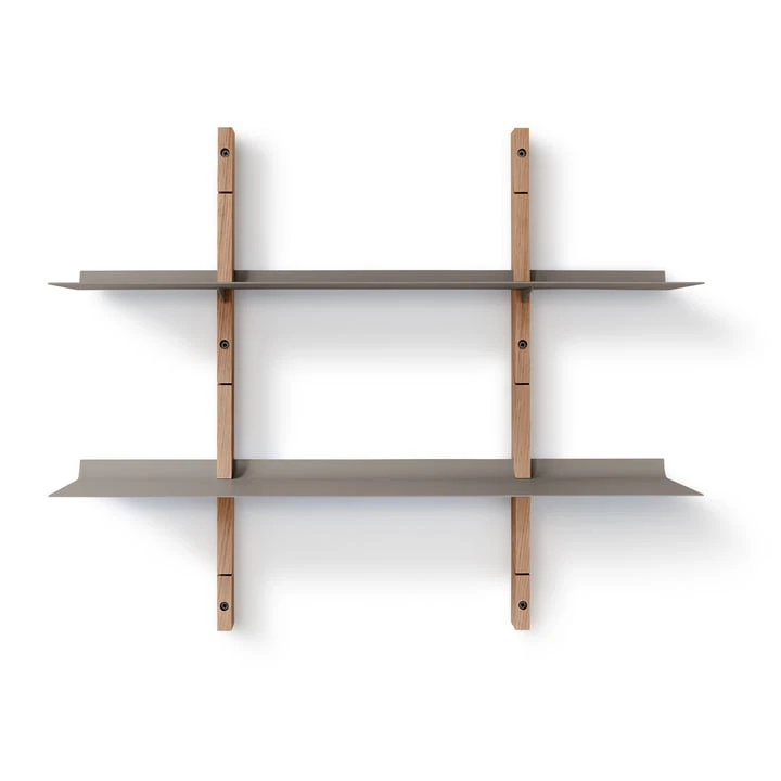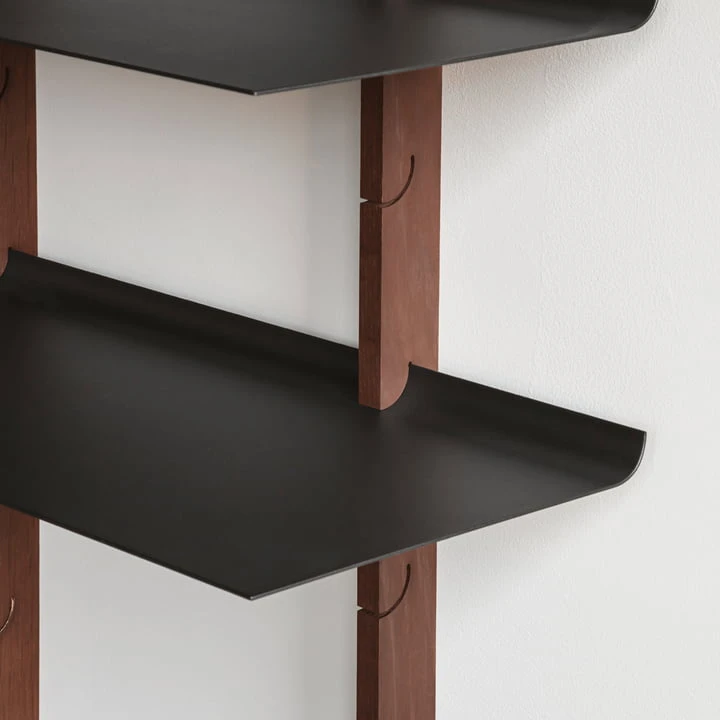 The shelving system consists of oak wood cheeks, which are provided with slots. The shelves made of powder-coated steel are simply hooked into these without the need for additional brackets. If desired, the shelves can also be moved again and again to create a new appearance. The shelves are also bent upwards towards the wall, so that books and other objects do not scratch the wall. The design for the Smile Shelving system comes from Tools Design.