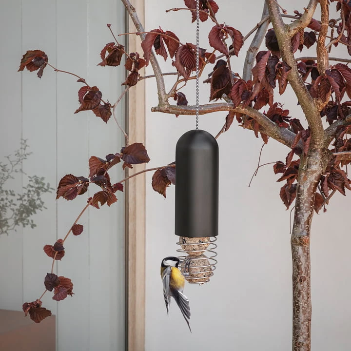 The tit dumpling holder of the label Eva Solo allows exceedingly easy and optimal access for all kinds of feathered friends! The hanging bird feeder can hold up to three tit dumplings. The feeder holder prevents large birds from snatching the treats away from the little ones. To refill food, simply lift the black lid. The tit dumpling holder can be easily attached to a tree or a gutter of a window with a cord. It is made of a material mix of polyester, powder-coated stainless steel.