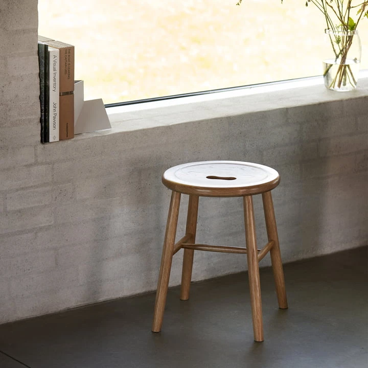 The design stool from FDB Møbler is available in beech and oak wood versions in various colors.