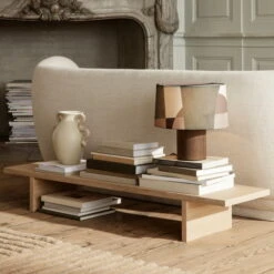 The Kona Low side table by ferm Living, which serves as a complement to the Kona bed , is made of lacquered oak veneer and protrudes under the bed frame to serve as a practical shelf for a book, lamp or glass of water. To save space, it can be easily hidden under the bed during the day.