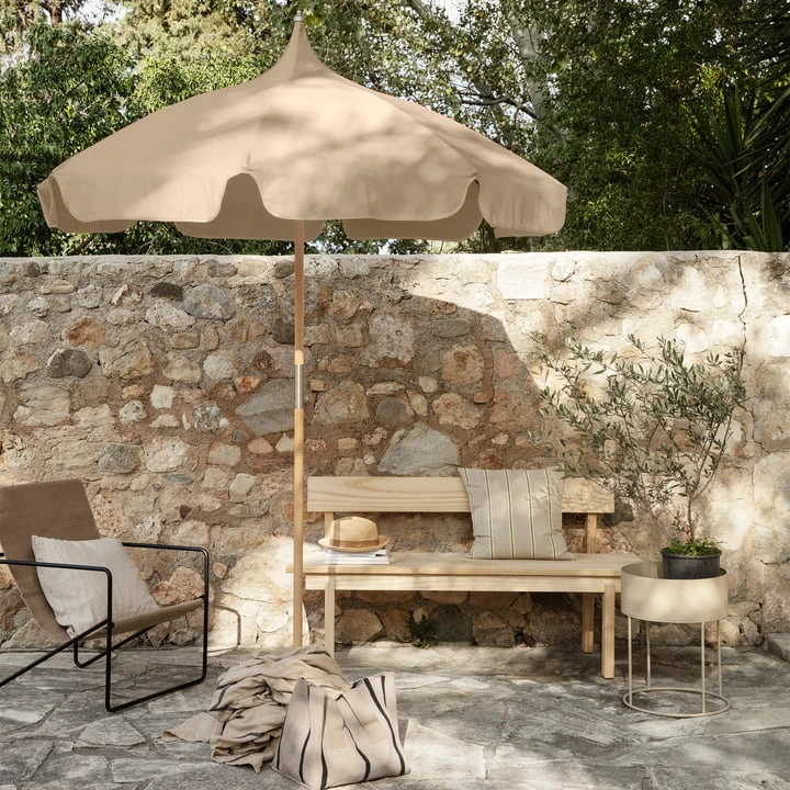 The Lull Parasol from ferm Living provides the perfect shield for the relentless heat of summer. The parasol invites relaxed and serene moments in the shade and is ideal for garden picnics at the beach and wherever protection from the sun is needed. With its romantic pagoda shape and FSC-Certified™ wooden handle, the umbrella provides a spacious area for communal outings. The Lull Umbrella offers UV30+ protection and comes in a convenient matching bag for easy transport.