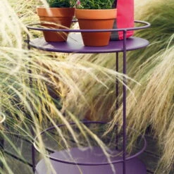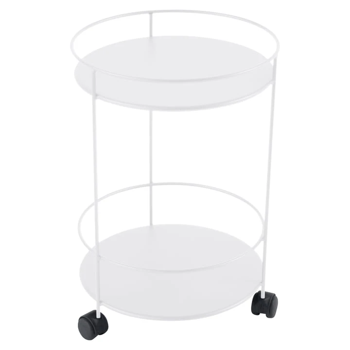 The Fermob side cart consists of a three-legged frame with two round shelves made of powder-coated and UV-resistant steel and three plastic casters.
