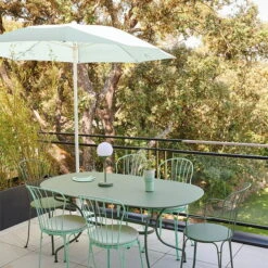 The Shadoo parasol from Fermob offers you optimal protection from the sun. The 2.5 meter wide umbrella is made of strong, tear-resistant Sunbrella fabric. Sunbrella fabric has the advantage of being water repellent and resistant to UV rays, stains and mildew. The aluminum handle and fiberglass ribs make the entire structure sturdy, but at the same time it can be easily moved at will. The handle can be divided into two, so it takes up little space and can be easily stored.