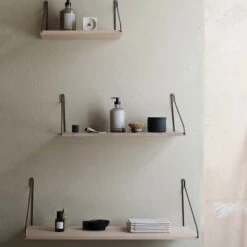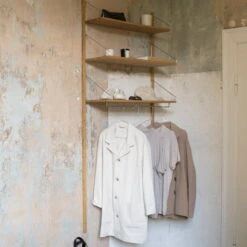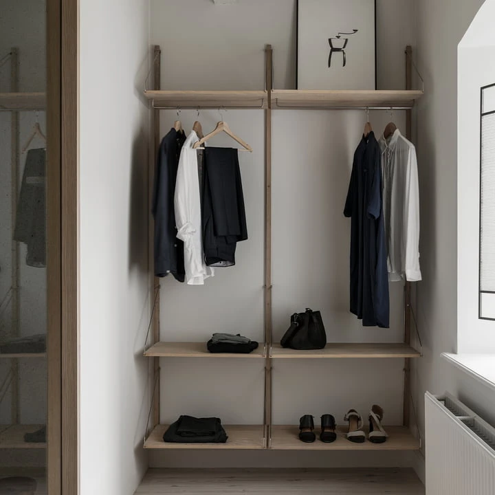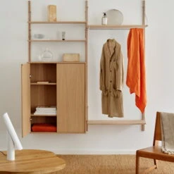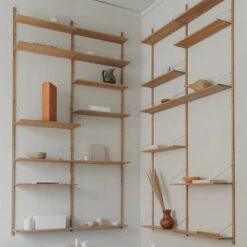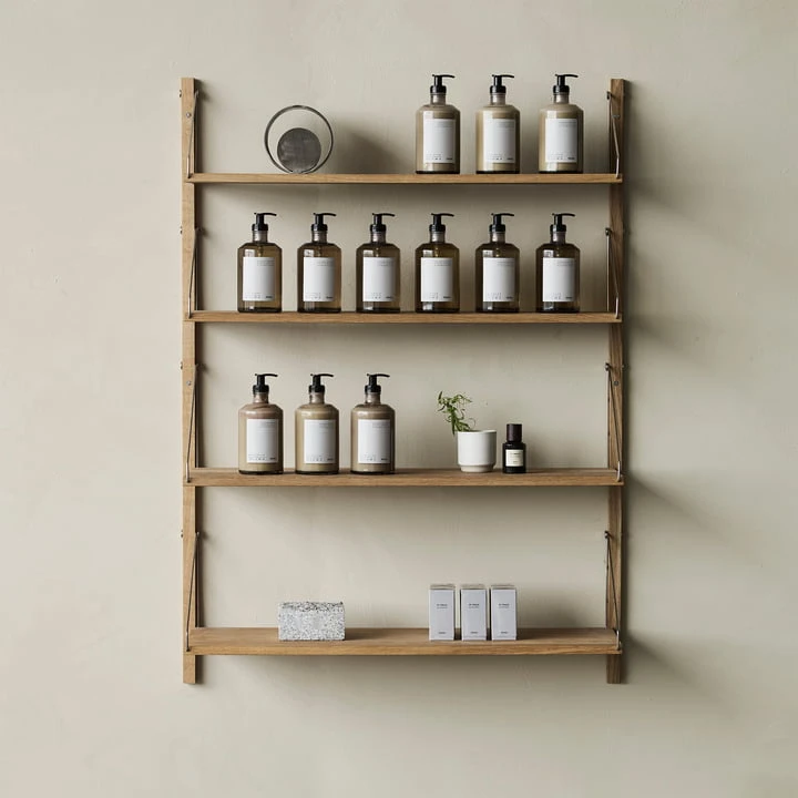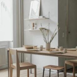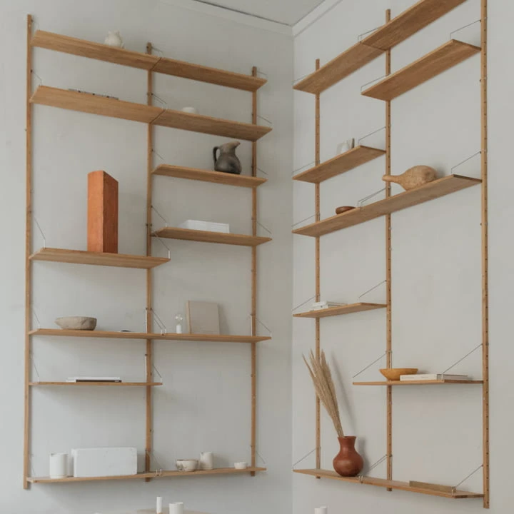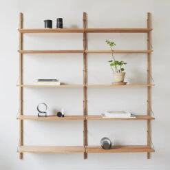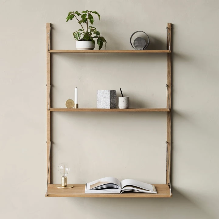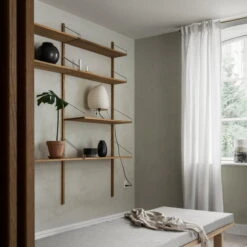 The Library Shelf and the desk module are available in two different sizes. Each shelf holds up to 25 kilograms of weight. The design is by Kim Richardt. Made of solid oiled oak.