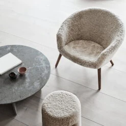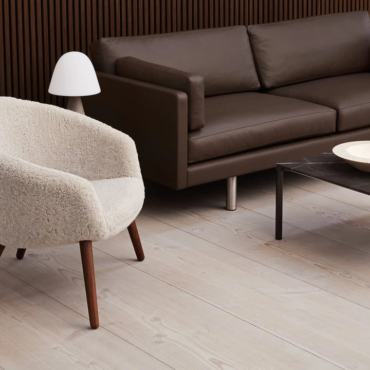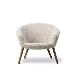 The curves of the Ditzel Lounge Chair are carefully thought out to look as elegant as possible from any angle. The wide, interlocking back and armrests and their luxurious upholstery provide maximum comfort. The modern interpretation of the traditional armchair is made of walnut wood and sheepskin.