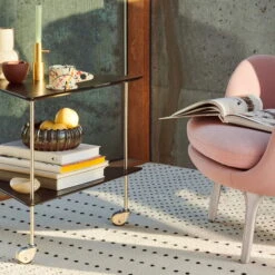The AJ trolley side table by the Danish manufacturer Fritz Hansen was originally designed by Arne Jacobsen for his afternoon tea. Thanks to its three wheels, it can also be used as a serving trolley, bar trolley or coffee table. The simple and timeless design fits into every living room or bedroom. The triangular shape makes the table a space-saving accessory on which drinks, books and vases look great.