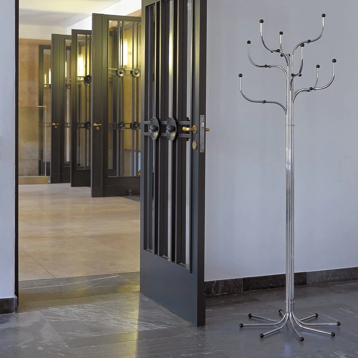 The clothes stand offers enough space for up to 48 coats. The simple design accords to the Scandinavian tradition of objectivity and partly organic shapes.