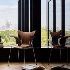 The Lilie anniversary chair was originally designed for the Danish National Bank in 1968. The version witharmrests was launched on the Danish furniture fair in 1970. On the occasion of Lilie ‘s 50th anniversary, Arne Jacobsen’s last chair design, Fritz Hansen now releasing the original version in walnut veneer.