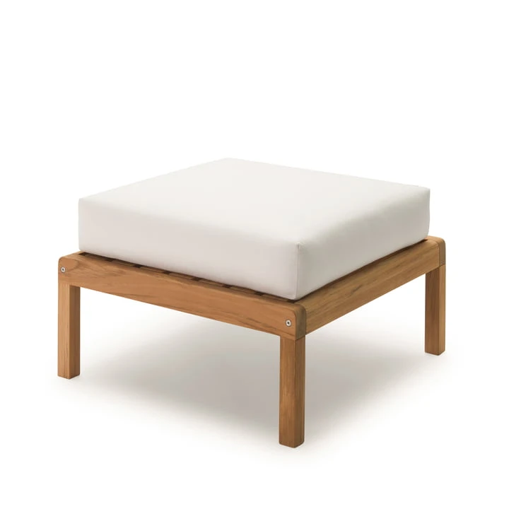 The teak gets a nice patina with time and the cover of the seat cushion can be cleaned in the washing machine. The seat cushion is filled with foam. The pouf is a great addition to the Virkelyst Armchair from Skagerak .
