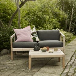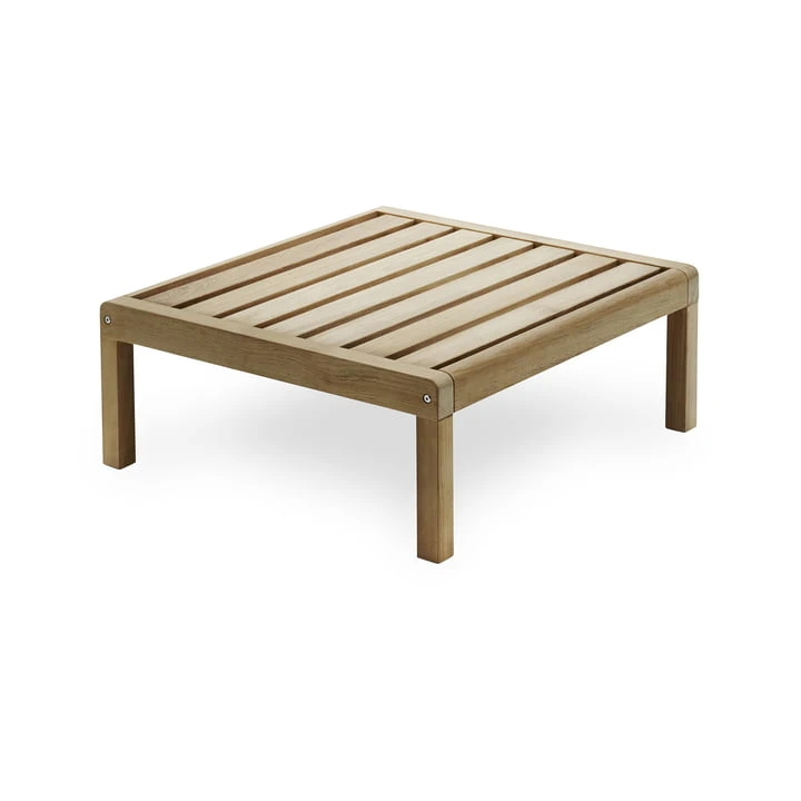 The Virkelyst Side Table by Says Who for Skagerak is an outdoor furniture piece that features clean lines. Its surface is made of teak slats that allow rainwater to drain easily while providing a light and airy appearance. The table top is enthroned on a rectilinear frame with a sled base.