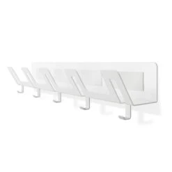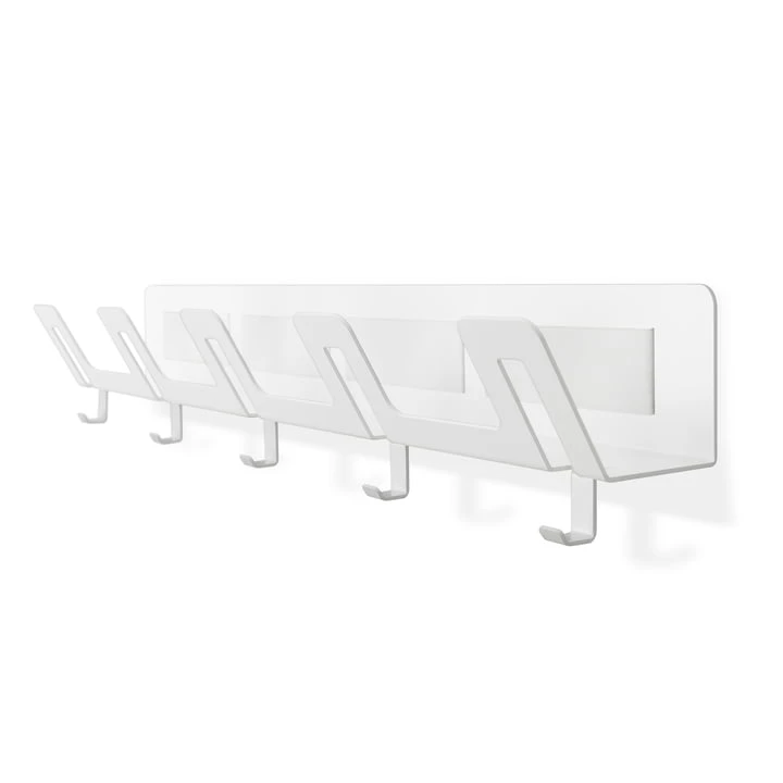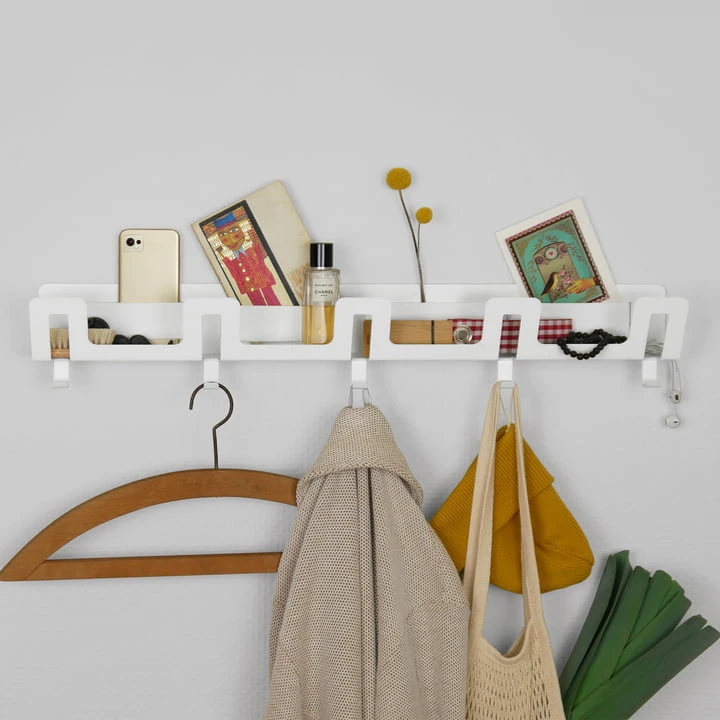 The coat rack Ella by Felix Stark for vonbox inspires with its slim, minimalist design. A total of five double hooks can be used to hang jackets, coats, bags and co. very simply. The practical: On the back of the coat rack is an integrated shelf, which is provided with a textile elastic band. Thus, all sorts of small things can be placed without any problems, without falling over or slipping.