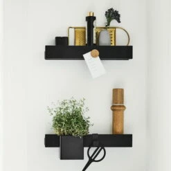 Flex is a configurable filing system from the Danish manufacturer Gejst, which can be designed according to your own wishes. The Flex shelf bar serves as the basis, to which suitable accessories such as utensil boxes, mirrors, shelves and handles can easily be attached. Thanks to the steel holder, the wooden front of the strip is also magnetic. Together with the Flex Buttons, which have a metallic core, it can easily be used as a pinboard. Shopping lists, photos and postcards find a place on the bar and are always in view.