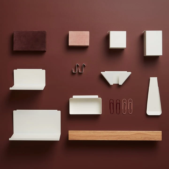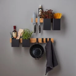 With Gejst’s utensil containers, the matching shelving from the Flex series can be wonderfully supplemented to create the required storage space. They are simply hooked into the bar and can be moved as desired.