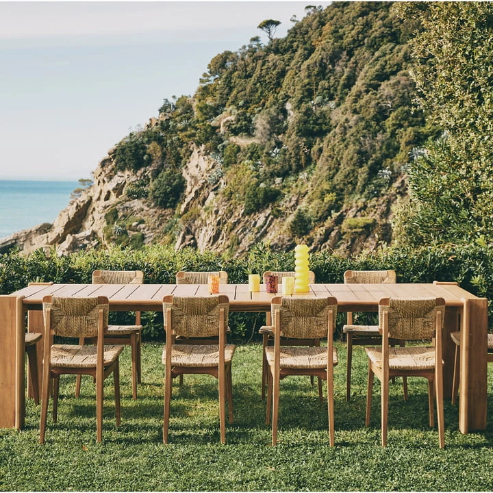 The Atmosfera Dining Table Outdoor by Milan-based design studio Gubi is a gem of fusion of contemporary designs and classical elements. In keeping with the title Atmosfera, the table collection – consisting of a side table and dining table – inspires with its atmospheric design. Characterized by quiet elegance and attention to detail, the Atmosfera collection looks wonderful in your outdoor space. The table tops are made of rhythmic, repeating slats of solid, high-quality teak. The table legs are made of two vertical slats joined together to create an inverted L-shape at each corner. Borrowing from architectural and maritime design, the unusual leg construction provides both stability, but at the same time it aroused the visual interest of the viewer.