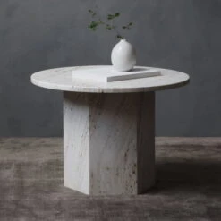 The monolithic shape emphasizes the exceptionally beautiful material – its stylish grain, high quality, unique surface. The various colours give every table personality and enhance every ambience! The design is modelled on ancient buildings such as St. Peter’s Basilica or the Colosseum in Rome, which were also built of travertine stone.