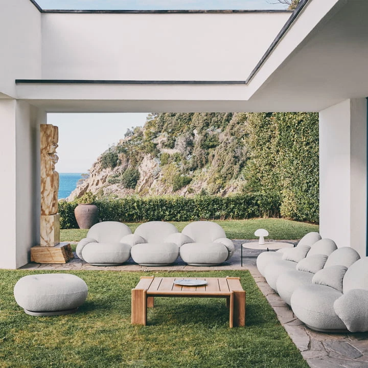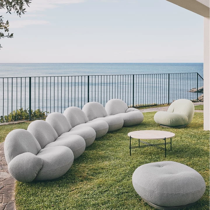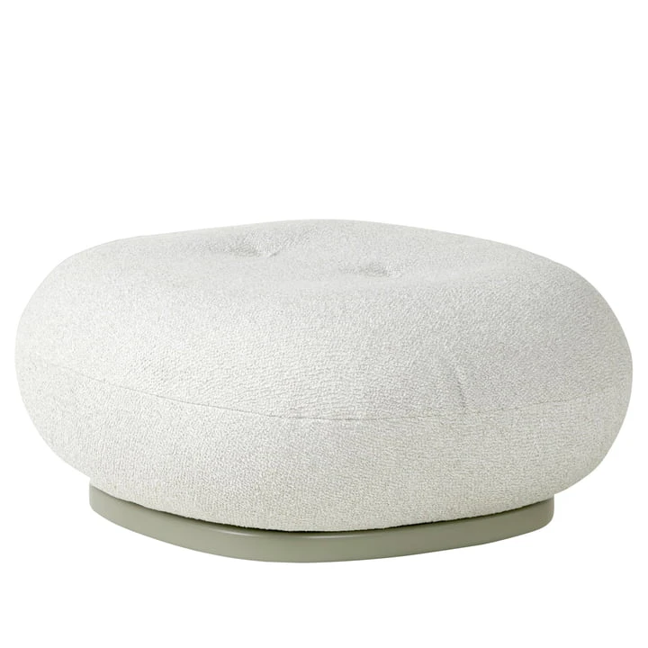 The Pacha Outdoor Ottoman pouf from the Danish manufacturer Gubi fits harmoniously to the body thanks to its rounded shape. The modern pouf with a plate base is covered with Dedar Belsuede. The cover fabric is made of 100% polypropylene. The Pacha Outdoor Ottoman pouf can be used indoors or outdoors, just as you like.