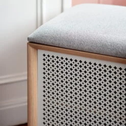 The frame of the Gabin Bench is made of solid oak. The structure is made of MDF finished with natural oak veneer. The sliding doors are made of perforated and painted metal. The seat is also made of MDF, and the upholstery is made of PU foam and fabric. Available in different colors.