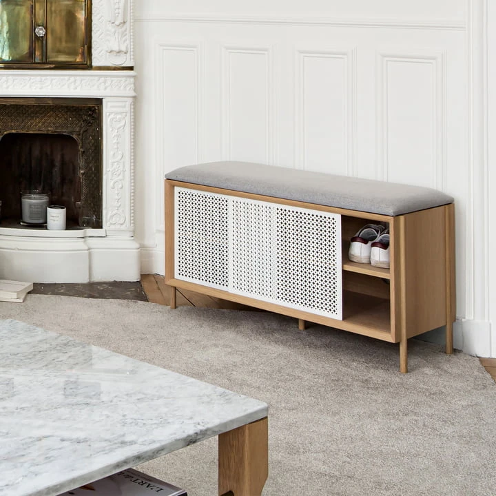 The Gabin Bench by Mathieu Galard for the French label Hart么 inspires with its modern look. The raw weave of its doors is reminiscent of motifs of the 60s. Design and structure merge skillfully with each other, so that function and design harmonize perfectly. The Gabin Bench is great for the entrance area / hallway. It comes with a seat cushion included.