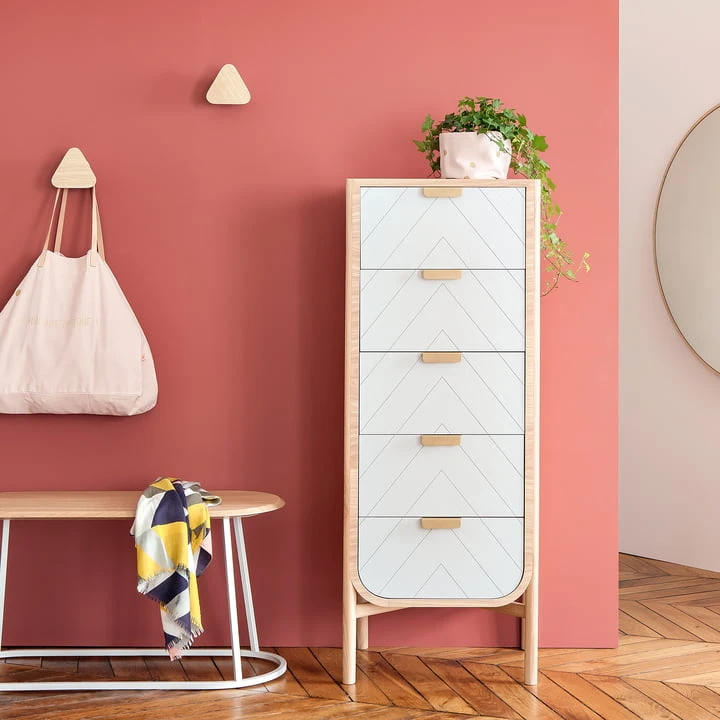 The narrow Marius Chest of drawers is a design of the French manufacturer Hart么 in a maritime look. The rounded corners recall the shape of a ship’s hull, while the pattern on the fronts of the drawers imitates the triangular contour of a sail.