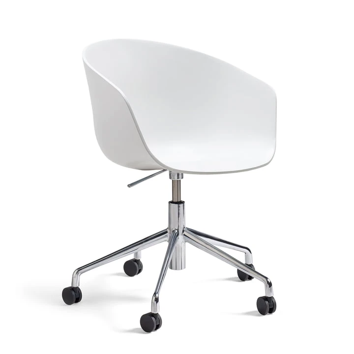 A five-star base made of polished aluminum is used as the underframe. Height adjustment is easily done by loading or unloading the chair and pressing the lever on the underside of the seat shell. The casters on the swivel chair complete the flexibility.