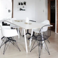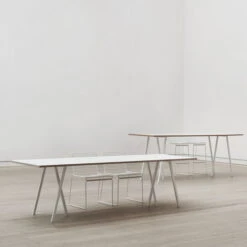 The Loop Stand able comes across as very down-to-earth too. Its smooth surface is complemented with clear edges. With the black version, the tabletop (linoleum) and edges (ash) are painted in the same colour, which makes the six-legged table appear elegant and chic. In white, the edges of the tabletop (laminate) are left in a natural wooden colour (plywood), giving Loop a classic Scandinavian holiday cottage appearance. The legs are made of lacquered, powder-coated steel.