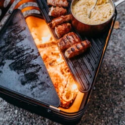 With the Plancha plate by höfats, the Cube fire basket is quickly and easily converted into a grill, ideal to cook meat, vegetables and more in a delicious way. The triangular plate made of enamelled cast iron is simply clamped at the desired height onto the cube. Low-fat cooking is made possible thanks to the non-stick coating on both the smooth side and the fluted side, as well as excellent heat distribution.