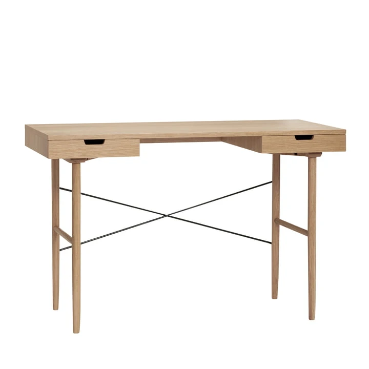 A practical desk that sets accents without looking bulky: This is the desk with 2 compartments from Hübsch Interior . The slim desk inspires with its filigree struts made of oak wood, which support the compact desk. On the right and left are practical compartments in which documents and writing utensils can be stored.