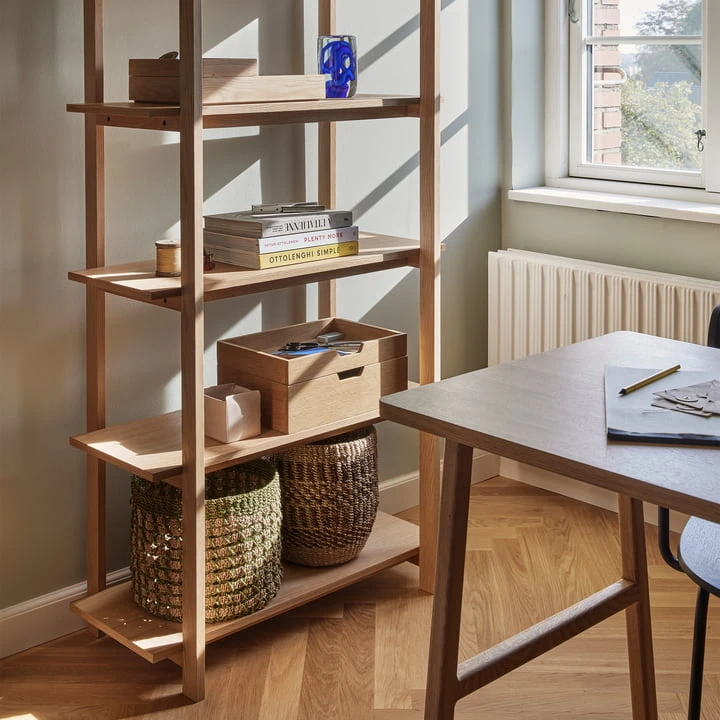 The open shelf with shelves is made of FSC®-certified oak and oak veneer, which makes it especially robust and durable.