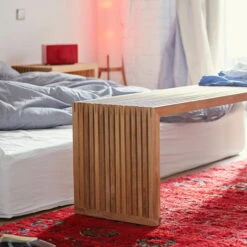 The dense processing of the wooden sticks provides a smooth surface, while the wood radiates a warm atmosphere. On the terrace, the bench becomes an outdoor seating area and in the bedroom or in the hallway, the bench becomes a generous storage space.
