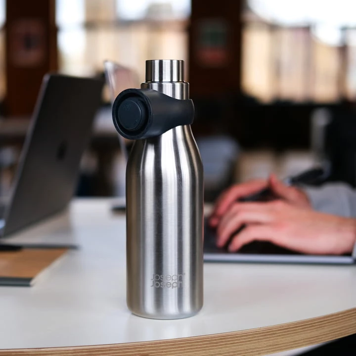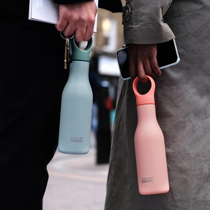 Joseph Joseph gives a new look to a Loop drinking bottle gives a conventional drinking bottle a new look. The vacuum insulated bottle holds 500 ml and is suitable for hot and cold drinks. The closure with loop handle not only ensures easy transport. Thanks to the loop, the closure can also be simply put over the bottle for easy storage.