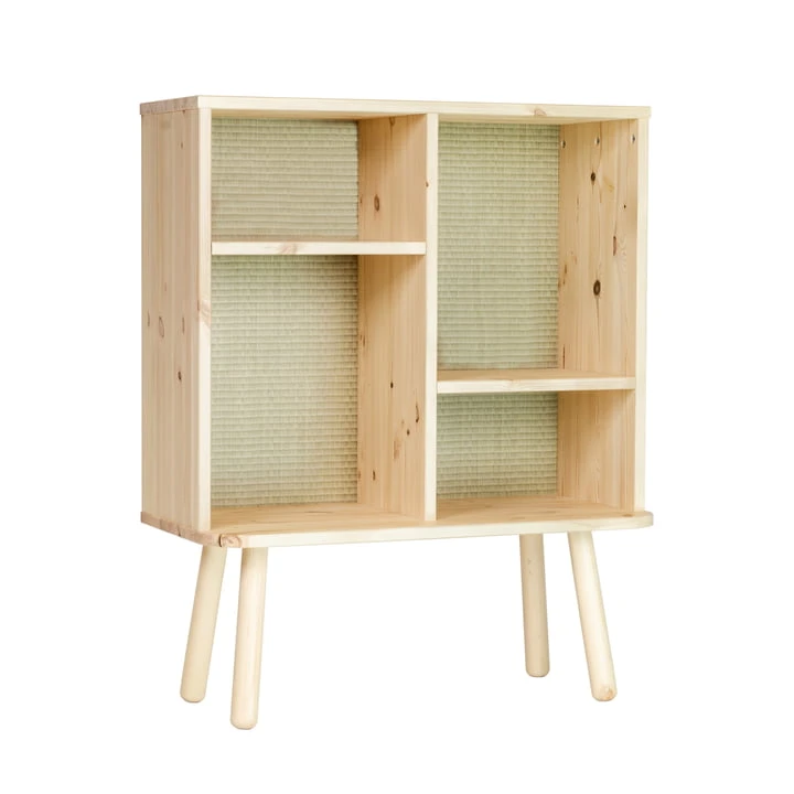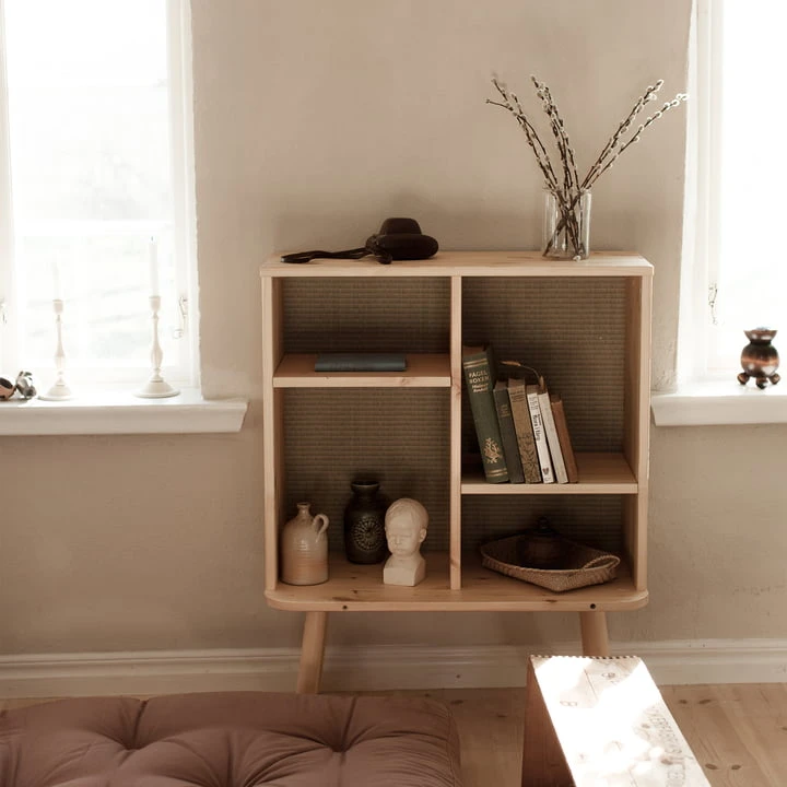 Kyabi is an open shelf with legs that can be used in many ways in the living room. The back wall of Karup Design’s shelf is designed in the Tatami look, a mat of rice straw that is often used as a doormat in Japan. The combination of natural pine wood and traditional elements creates a stylish piece of furniture in Wabi-Sabi style that brings peace and harmony to the room.