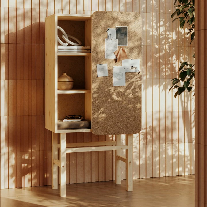 The Slide Cabinet with pinboard by Danish manufacturer Karup Design is a multifunctional piece of furniture. It is a cabinet and a pinboard in one! Thanks to the pinboard, the cabinet can be customized with photos, notes and postcards. The combination of cork and pine wood gives the cabinet a natural Slide The combination of cork and pine gives the cabinet a natural, simple look that fits beautifully into a modern home. The pinboard can be easily moved, so that you – depending on your needs – hide your items or just put them in scene.