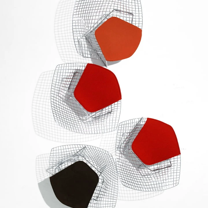 The Diamond Chair from Bertoia has been placed in many collections of famous design museums today. It possesses a classic, modern design that enlarges every surrounding. His filigree form reminds one more of a sculpture than a lounger; however, the Diamond Chair is extremely comfortable and fulfils all practical demands of seating furniture.