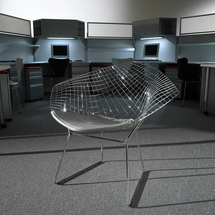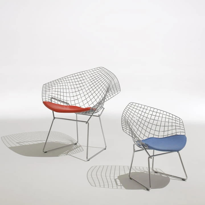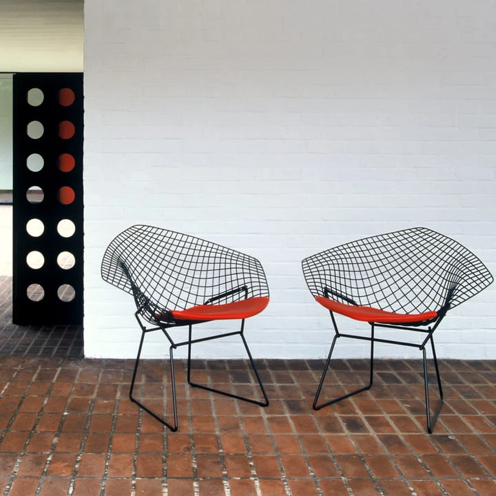 - Characteristics: a classic, modern design that enlarges every surrounding. The Harry Bertoia Diamond Lounger is a fascinating study of bent round steel and an icon of the middle of the previous century. Available with whole upholstery or only with cushions. The logo “Knoll” is imprinted on the lower frame.