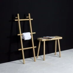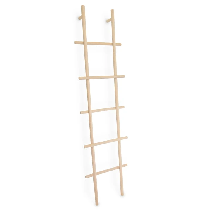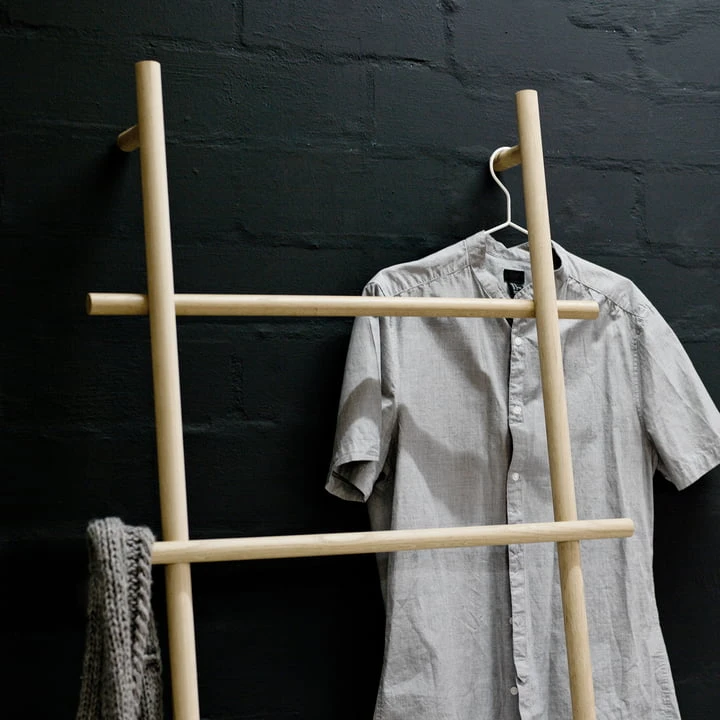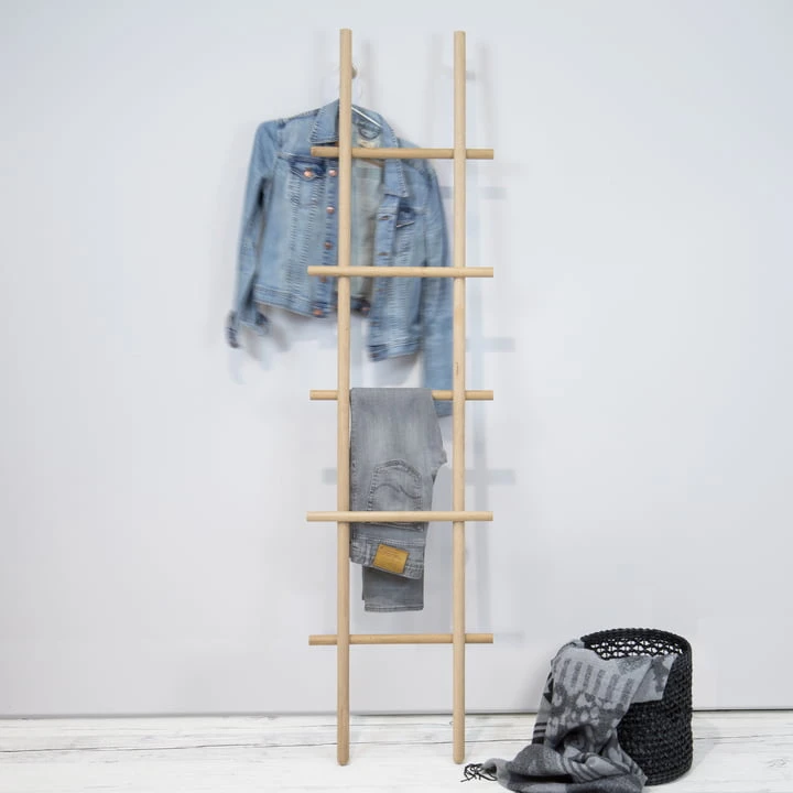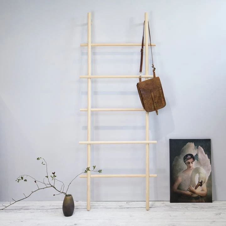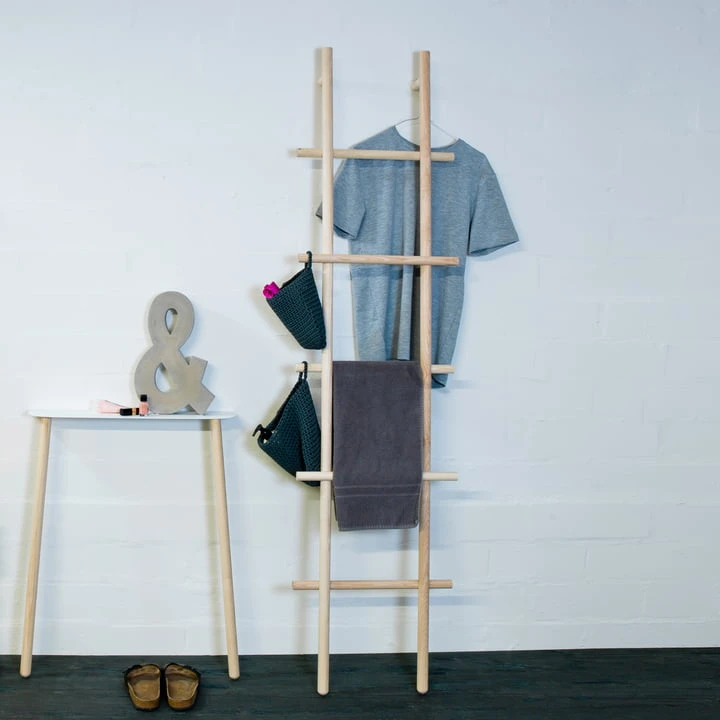 The Loadah storage ladder from kommod is a simple and at the same time highly functional solution as an alternative to the hall stand or towel rack in the corridor, bathroom or bedroom. Simply leaned against the wall, the ladder can hold scarves, towels, etc. on its five rungs without the hassle of assembly. With the help of hooks and hangers (not included), the ladder can also accommodate pots, clothes, jackets and much more.