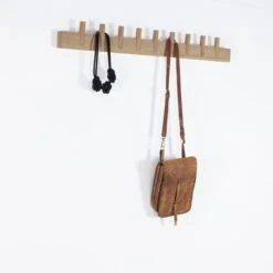 Steqs by kommod is a hanging coat rack with a simple design, that convinces its users with its high level of functionality. The coat rack consists of a board for the wall and oak bars as coat hooks, which can be inserted into the existing oblique holes as desired.